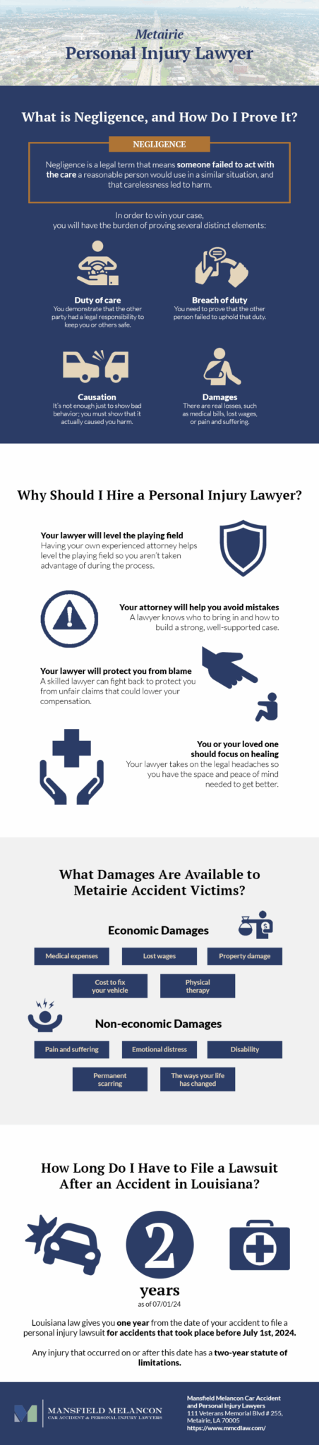 If you have been injured in Metairie, LA, due to someone else’s negligence, it’s important to know you have legal rights. If you need help with a claim, call Mansfield Melancon Car Accident and Personal Injury Lawyers at (888) 601-0127 to schedule a free consultation with a Metairie personal injury lawyer.